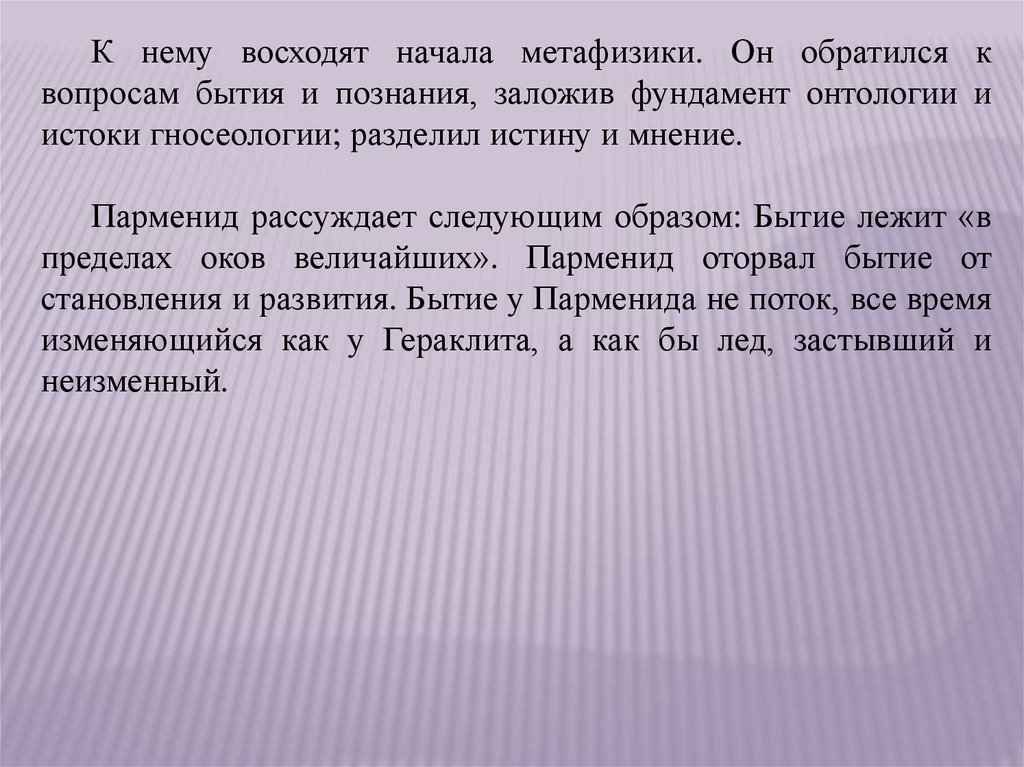 К нему восходят начала метафизики. Он обратился квопросам бытия и познания, заложив фундамент онтологии и