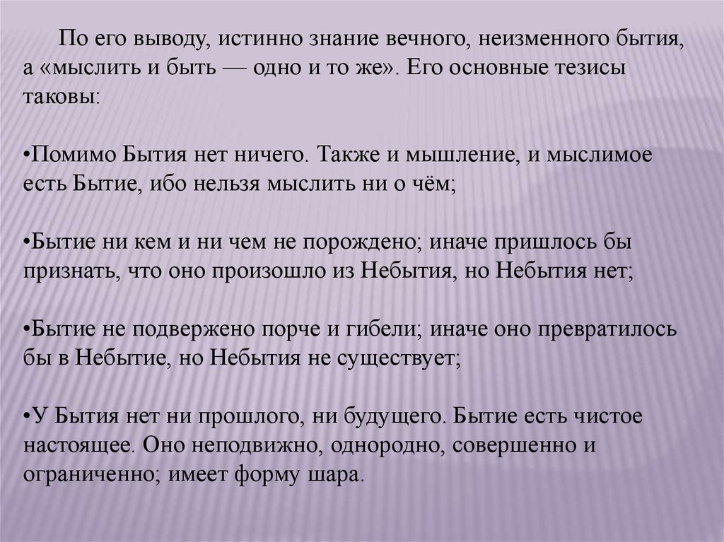 По его выводу, истинно знание вечного, неизменного бытия,а «мыслить и быть — одно и то же». Его основные тезисы