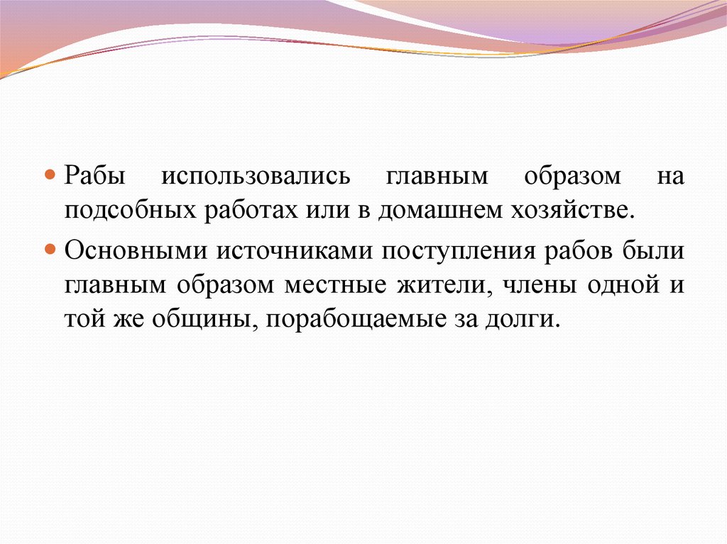 Рабы использовались главным образом наподсобных работах или в домашнем хозяйстве.