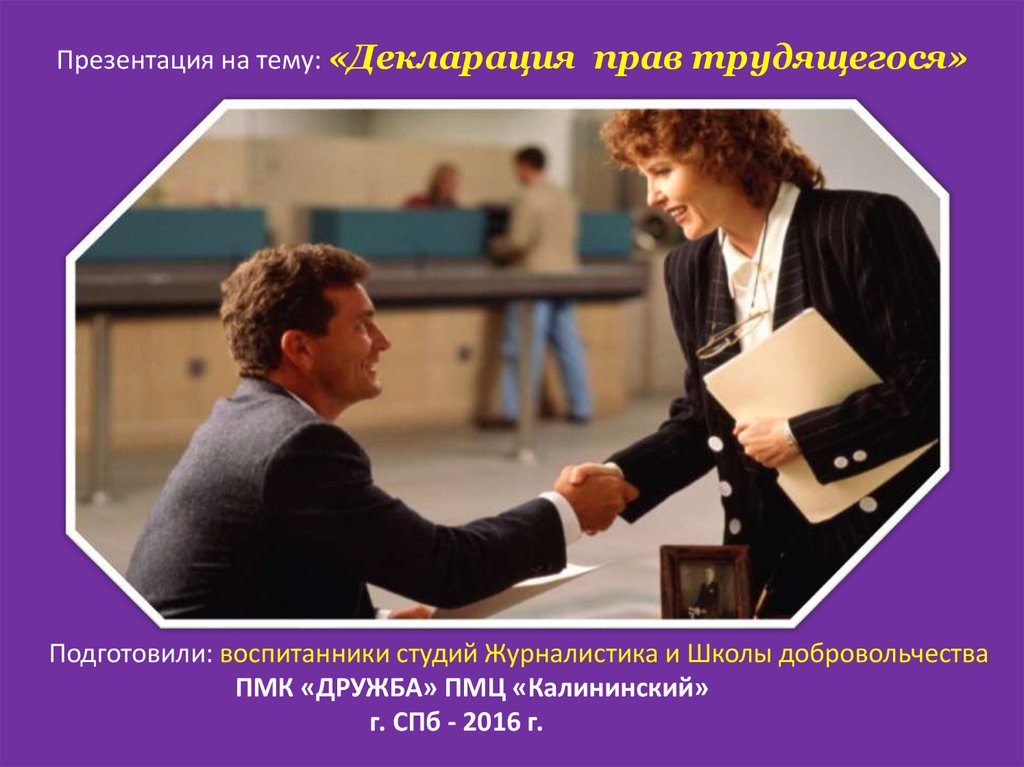 Презентация на тему: «Декларация прав трудящегося»Подготовили: воспитанники студий Журналистика и Школы добровольчества