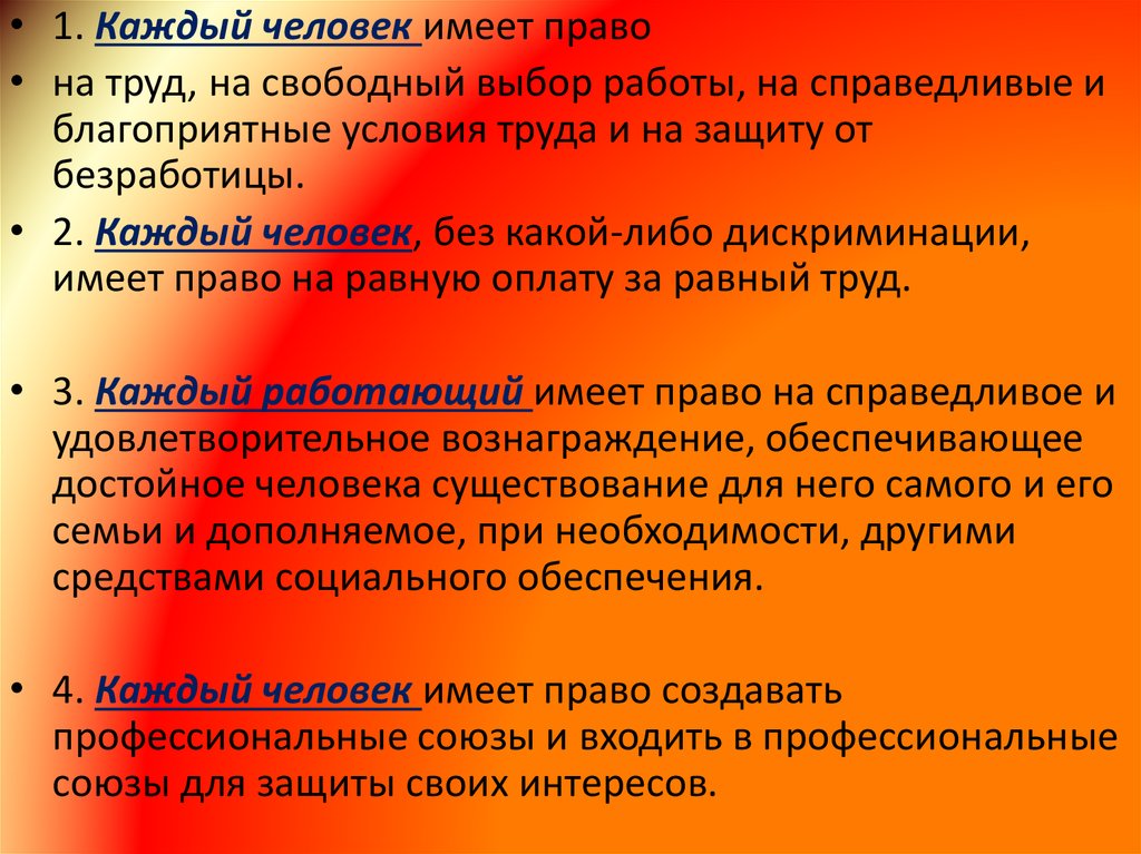 • 1. Каждый человек имеет право• на труд, на свободный выбор работы, на справедливые и
