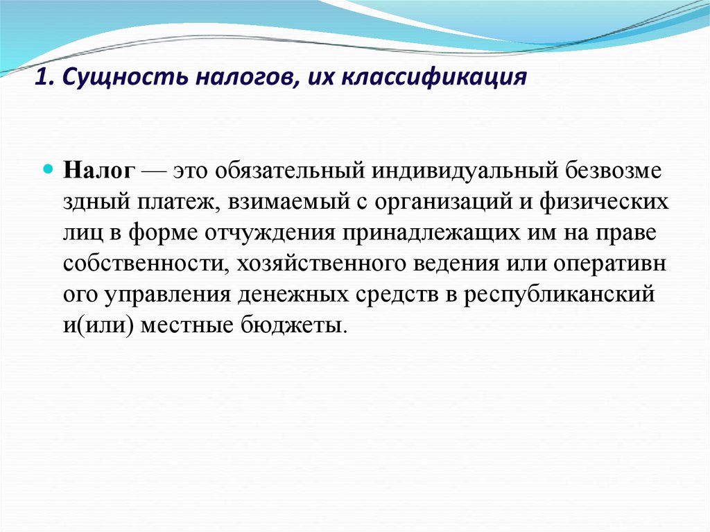1. Сущность налогов, их классификацияНалог — это обязательный индивидуальный безвозме