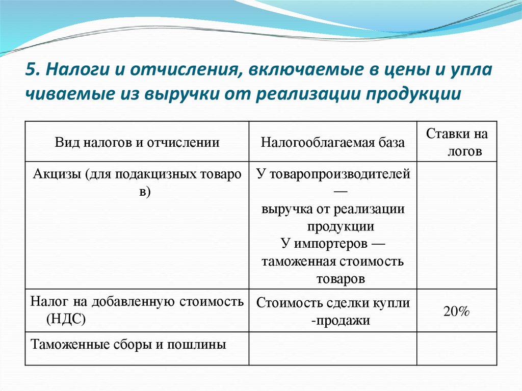 5. Налоги и отчисления, включаемые в цены и уплачиваемые из выручки от реализации продукции