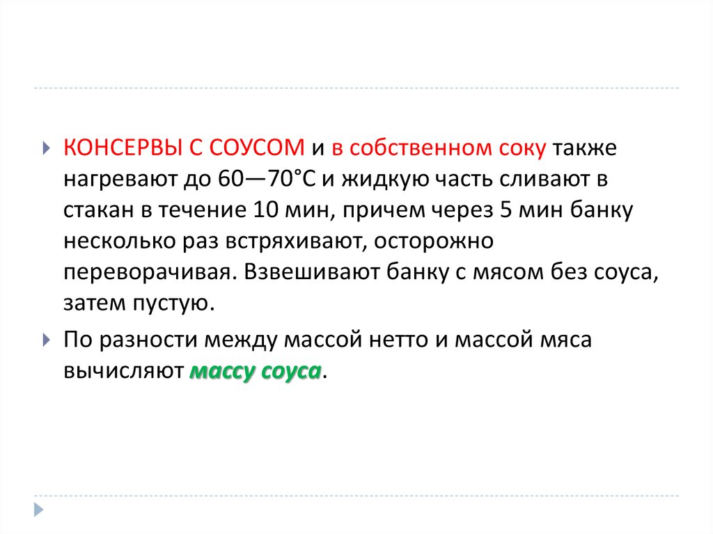 КОНСЕРВЫ С СОУСОМ и в собственном соку такженагревают до 60—70°С и жидкую часть сливают в