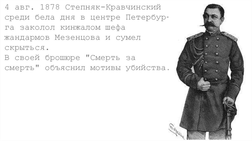 4 авг. 1878 Степняк-Кравчинскийсреди бела дня в центре Петербурга заколол кинжалом шефа