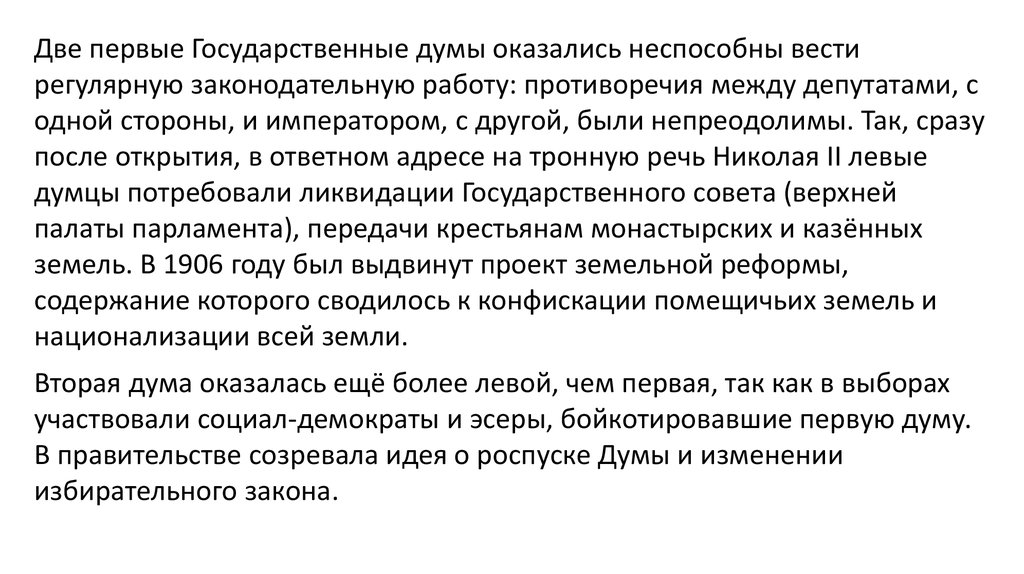 Две первые Государственные думы оказались неспособны вестирегулярную законодательную работу: противоречия между депутатами, с