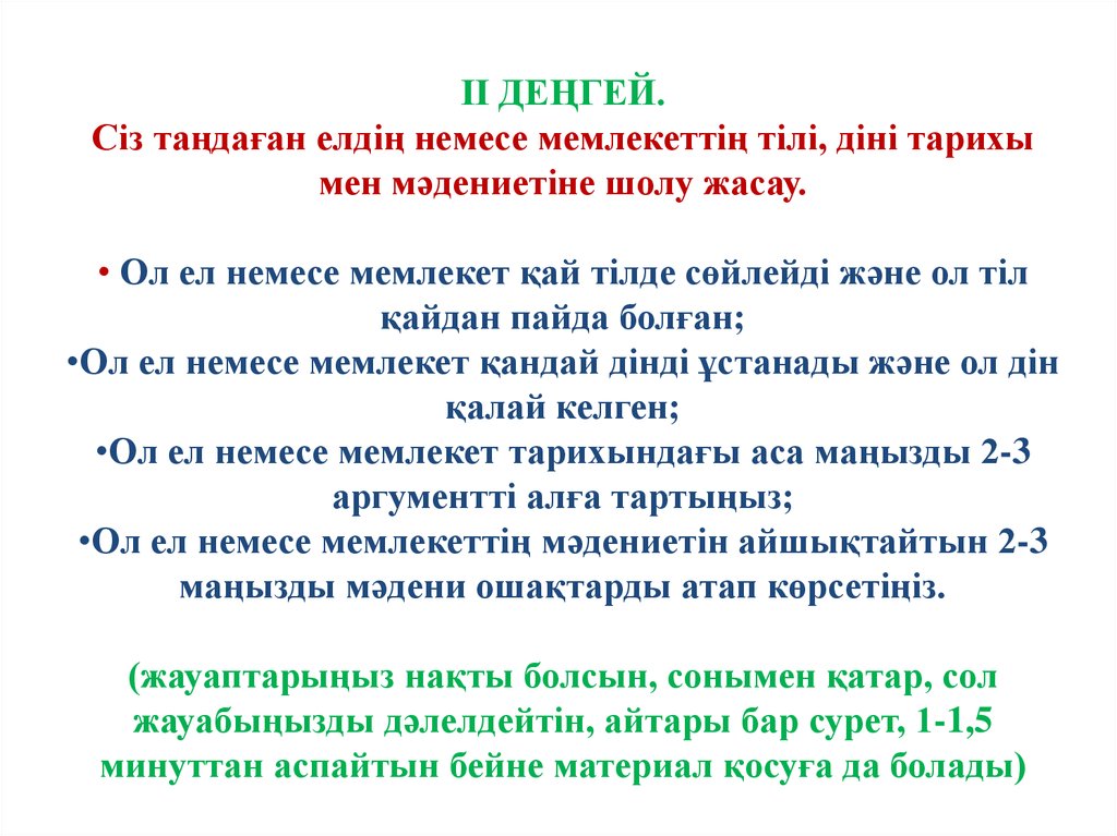 ІІ ДЕҢГЕЙ.Сіз таңдаған елдің немесе мемлекеттің тілі, діні тарихы