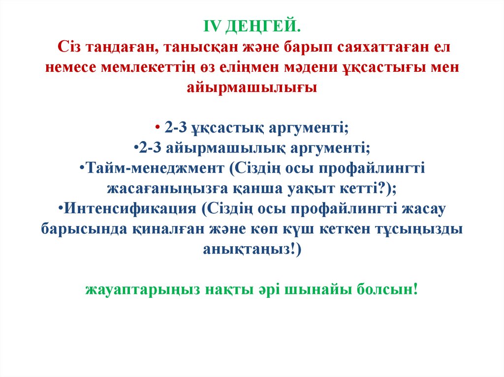 ІV ДЕҢГЕЙ.Сіз таңдаған, танысқан және барып саяхаттаған ел