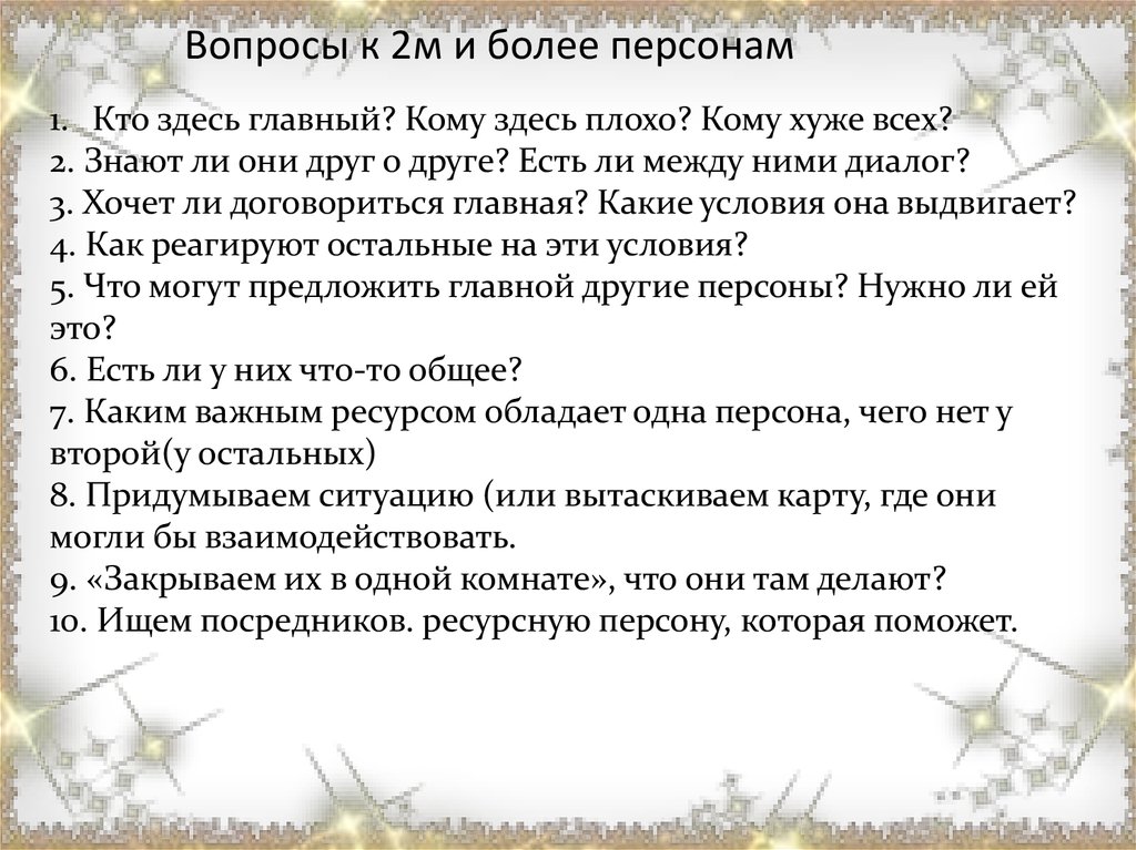 Вопросы к 2м и более персонам1. Кто здесь главный? Кому здесь плохо? Кому хуже всех?
