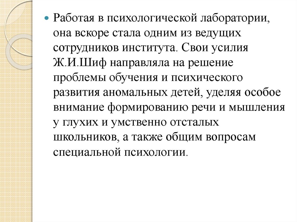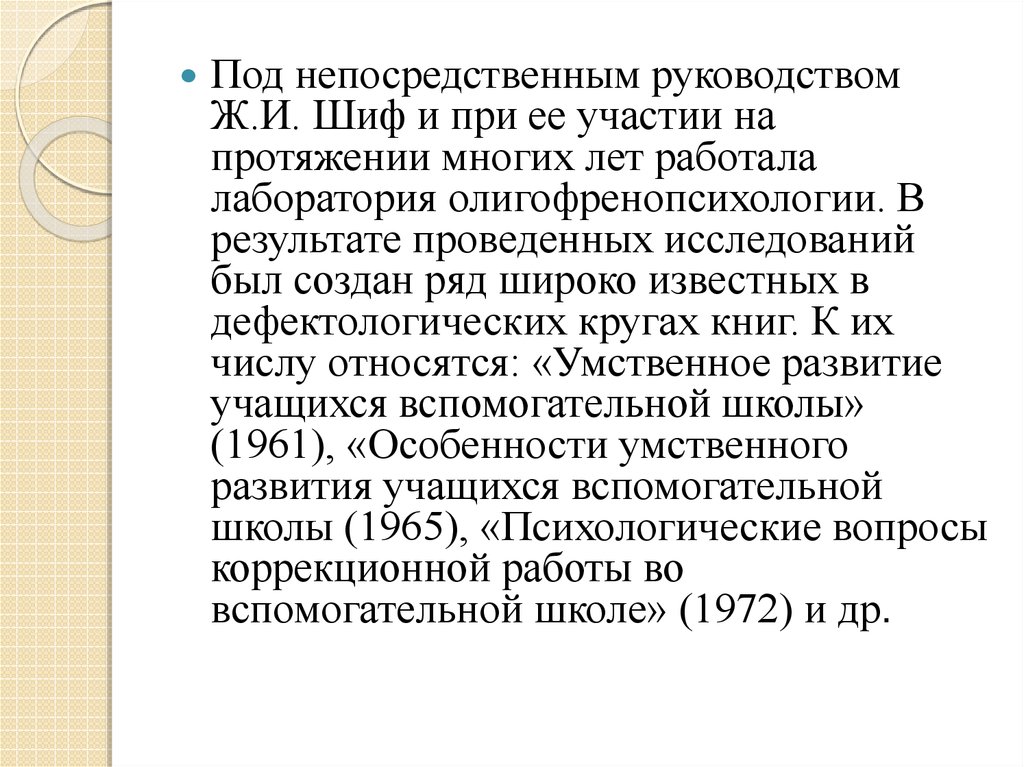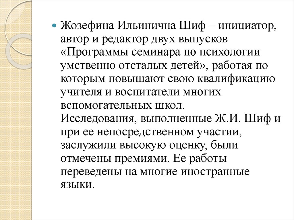Жозефина Ильинична Шиф – ученыйпсихолог, дефектолог, профессор, докторпсихологических наук – была одним из