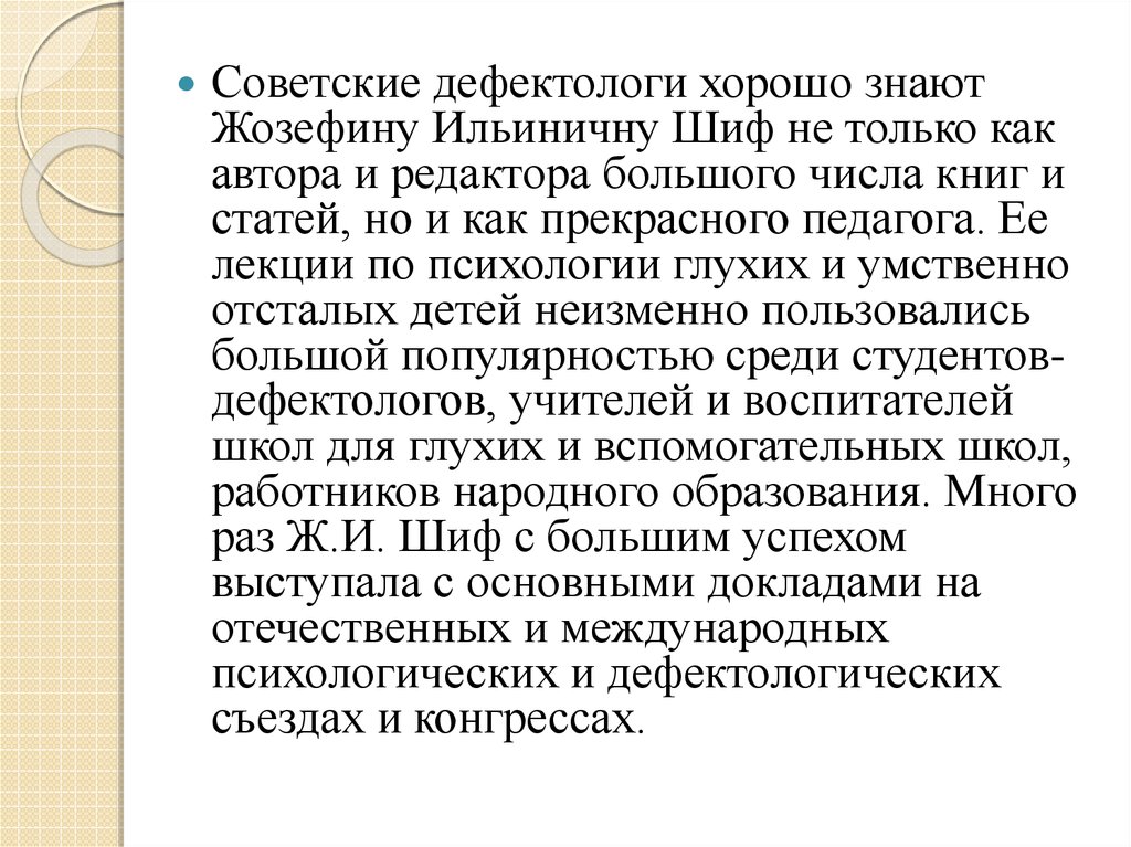 Советские дефектологи хорошо знаютЖозефину Ильиничну Шиф не только как