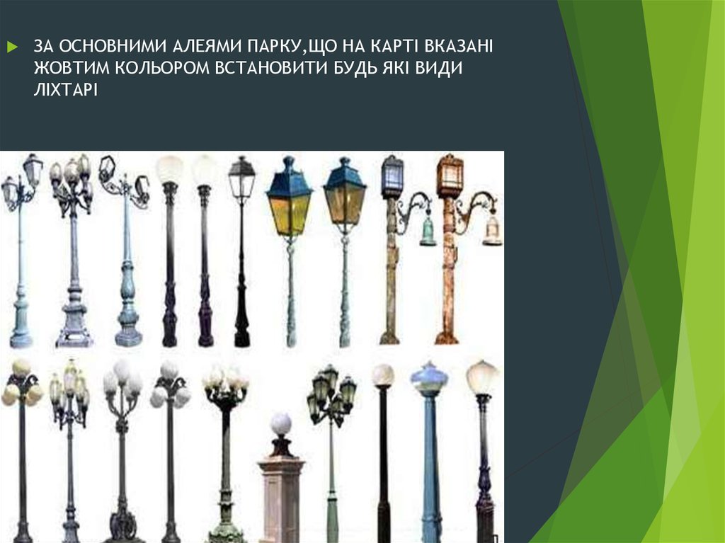 ЗА ОСНОВНИМИ АЛЕЯМИ ПАРКУ,ЩО НА КАРТІ ВКАЗАНІЖОВТИМ КОЛЬОРОМ ВСТАНОВИТИ БУДЬ ЯКІ ВИДИ