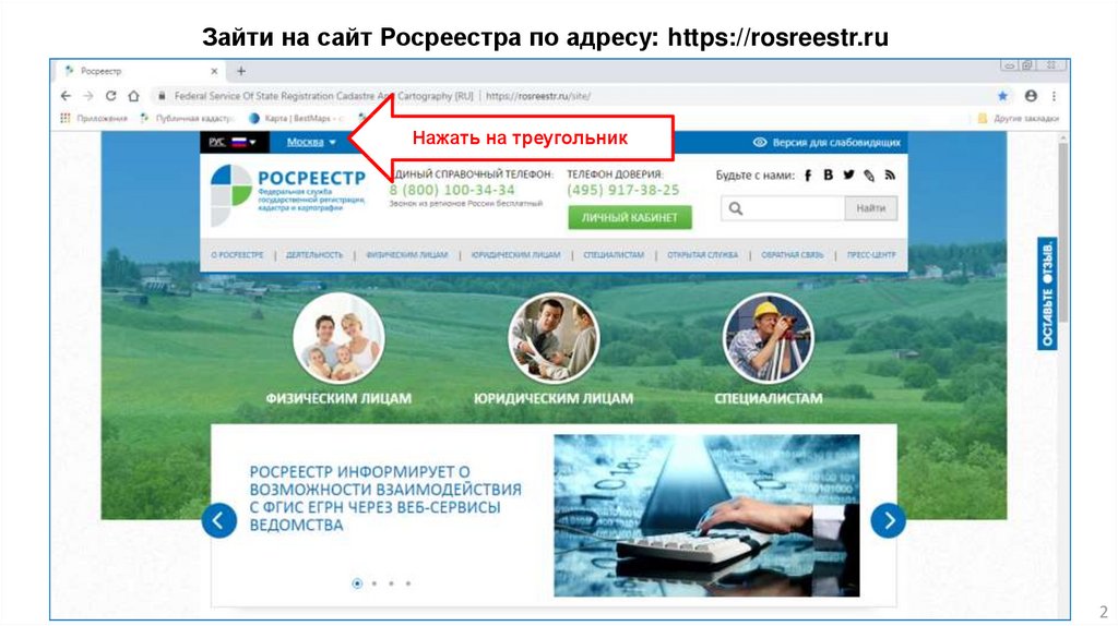 Зайти на сайт Росреестра по адресу: https://rosreestr.ruНажать на треугольник