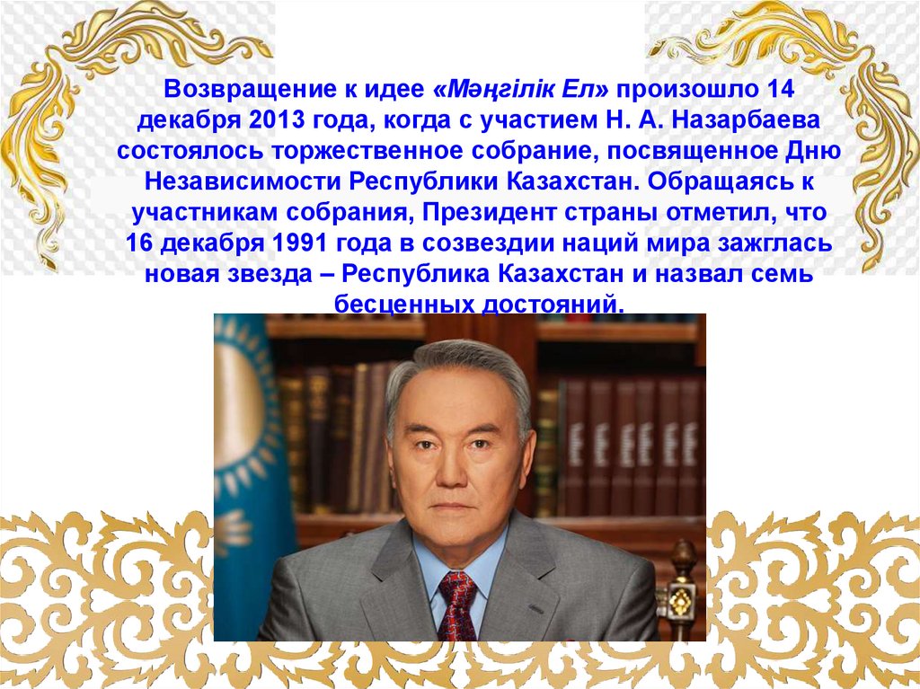 Возвращение к идее «Мәңгілік Ел» произошло 14декабря 2013 года, когда с участием Н. А. Назарбаева