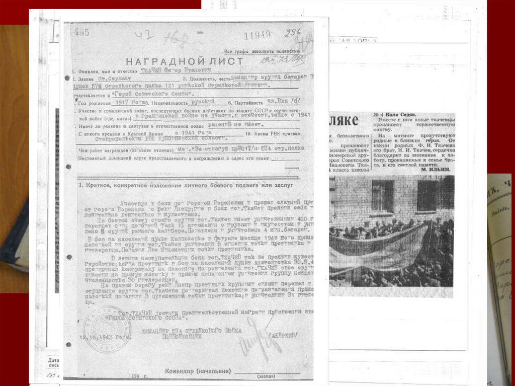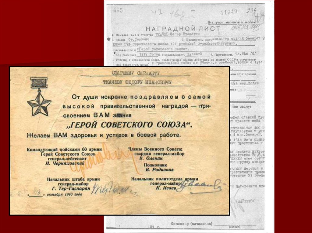 7. 28 сентября 1943 г. старший сержант Федор Ткачев в составе штурмовой группы в числе первых переправился через Днепр в районе с.