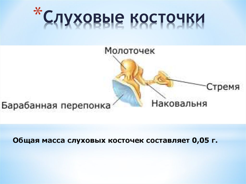 *Слуховые косточкиОбщая масса слуховых косточек составляет 0,05 г.