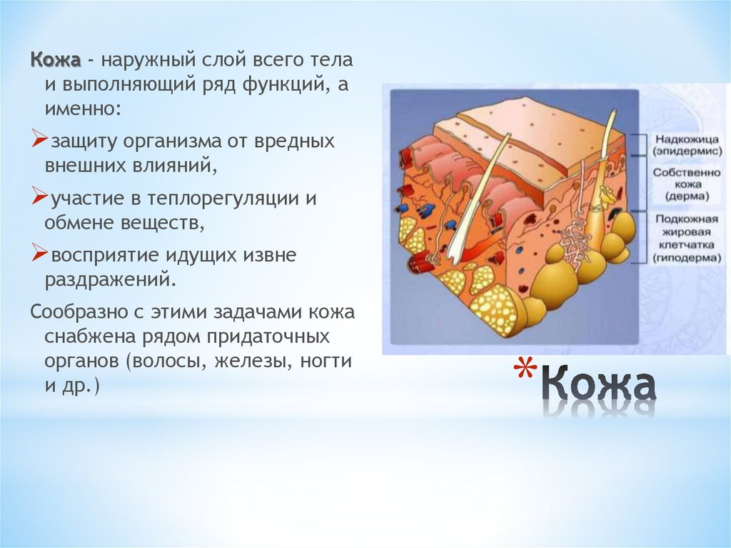 Кожа - наружный слой всего телаи выполняющий ряд функций, а