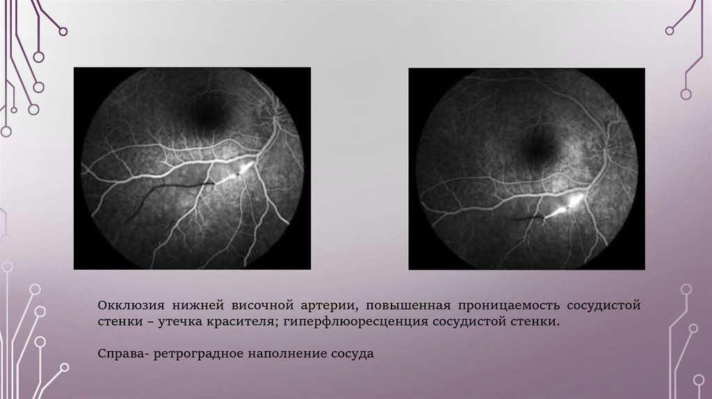 Окклюзия нижней височной артерии, повышенная проницаемость сосудистойстенки – утечка красителя; гиперфлюоресценция сосудистой стенки.