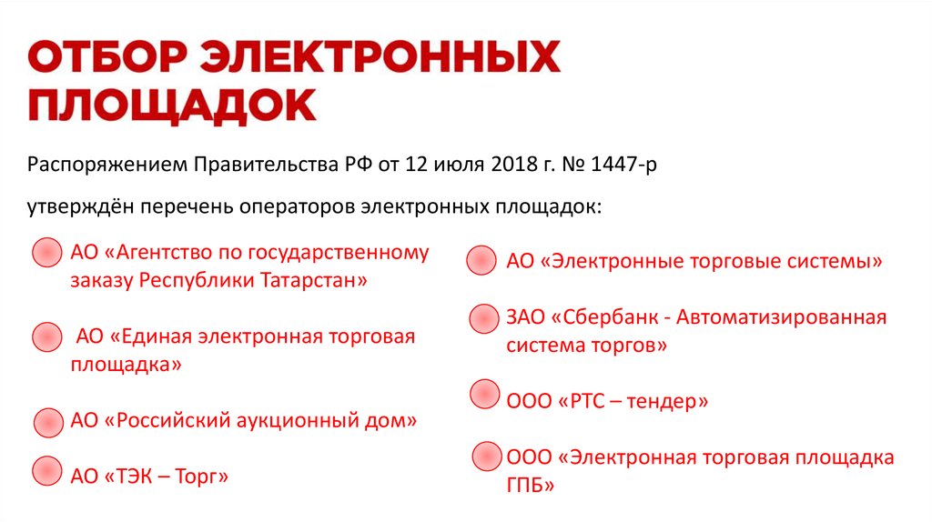 Распоряжением Правительства РФ от 12 июля 2018 г. № 1447-рутверждён перечень операторов электронных площадок: