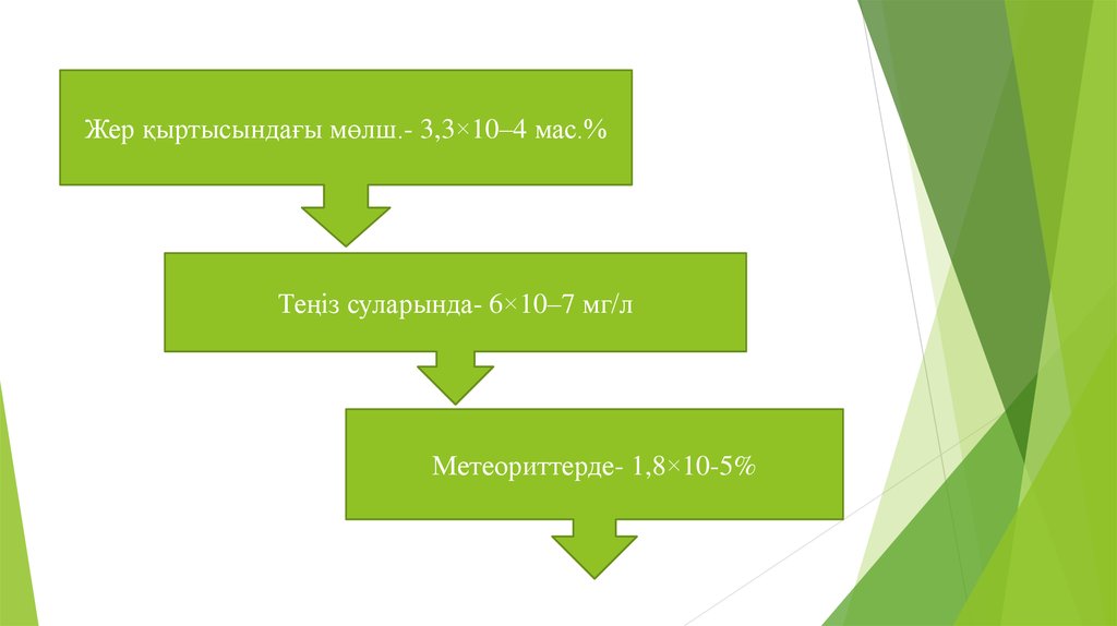 Жер қыртысындағы мөлш.- 3,3×10–4 мас.%Теңіз суларында- 6×10–7 мг/л