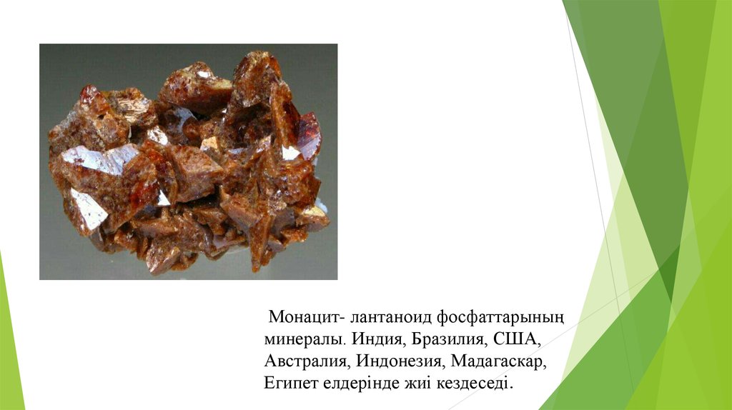 Монацит- лантаноид фосфаттарыныңминералы. Индия, Бразилия, США,