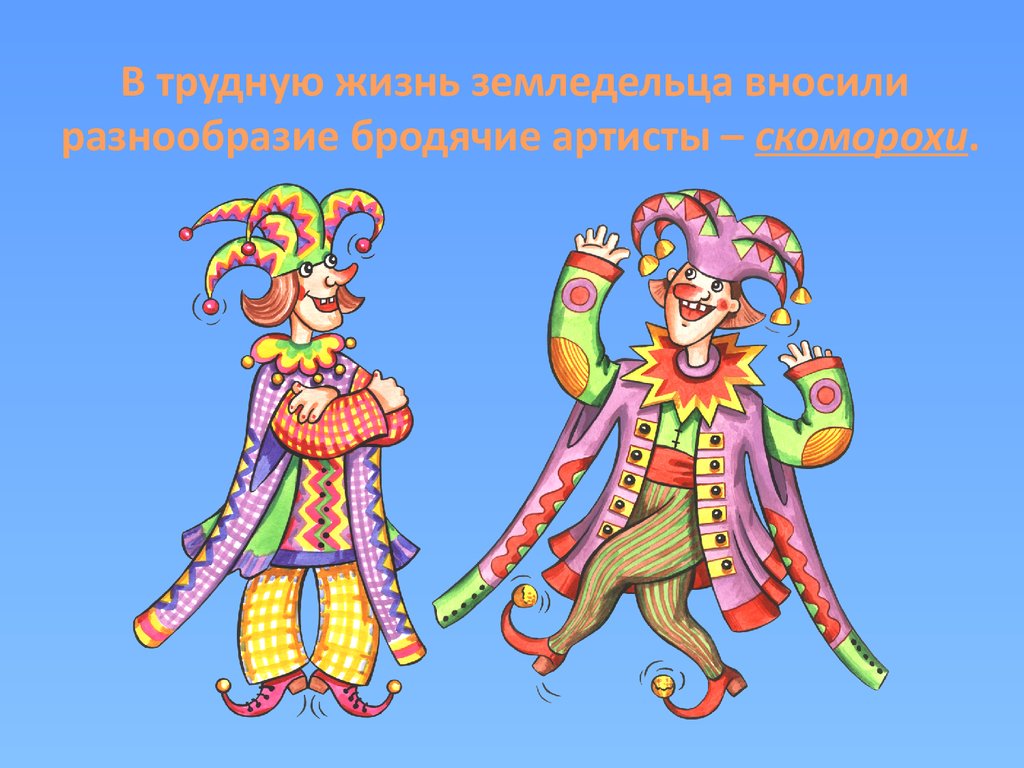 В трудную жизнь земледельца вносилиразнообразие бродячие артисты – скоморохи.