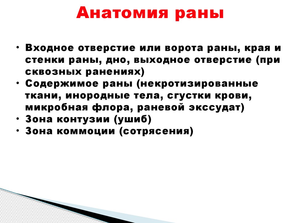Анатомия раны• Входное отверстие или ворота раны, края и