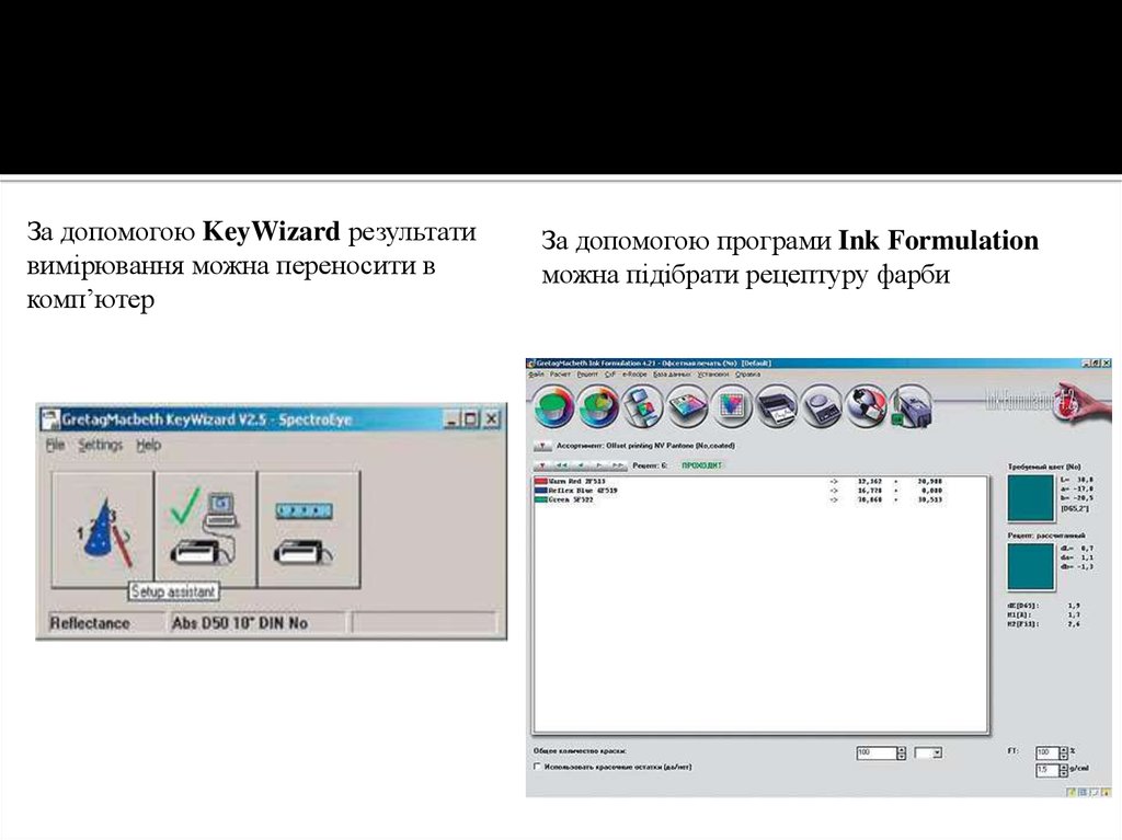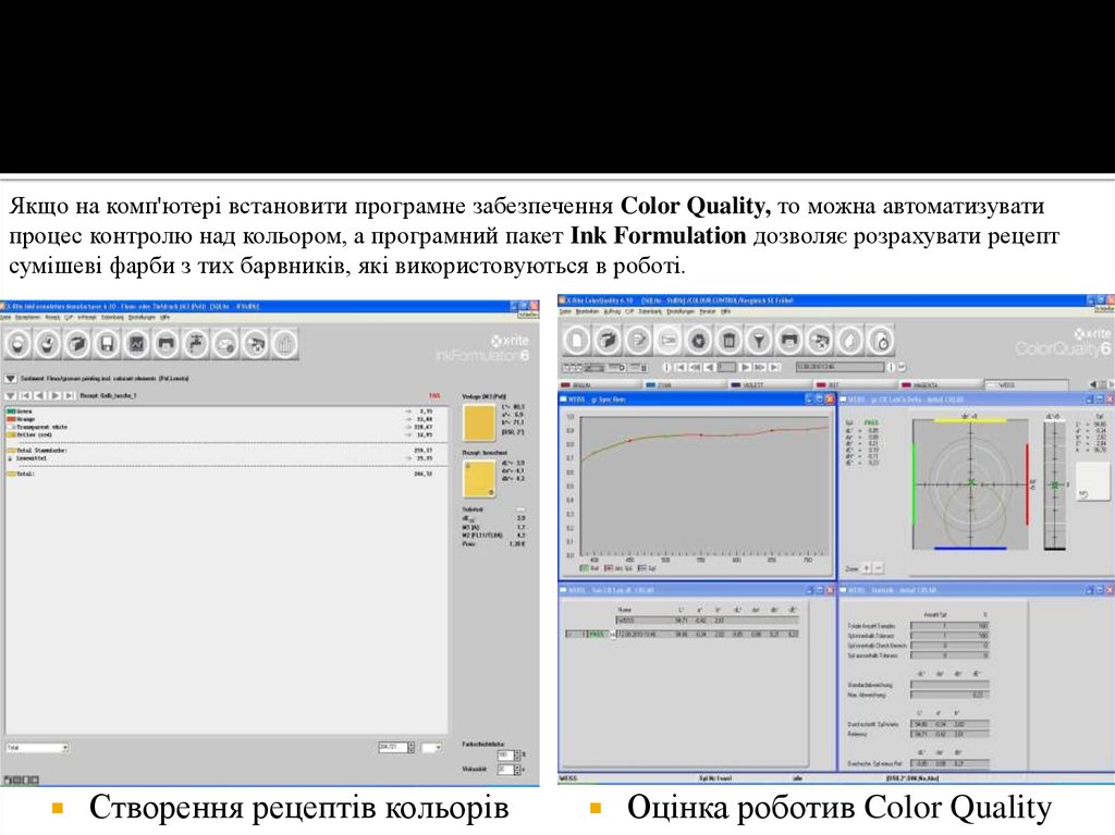 Якщо на комп'ютері встановити програмне забезпечення Color Quality, то можна автоматизуватипроцес контролю над кольором, а програмний пакет Ink Formulation дозволяє розрахувати рецепт