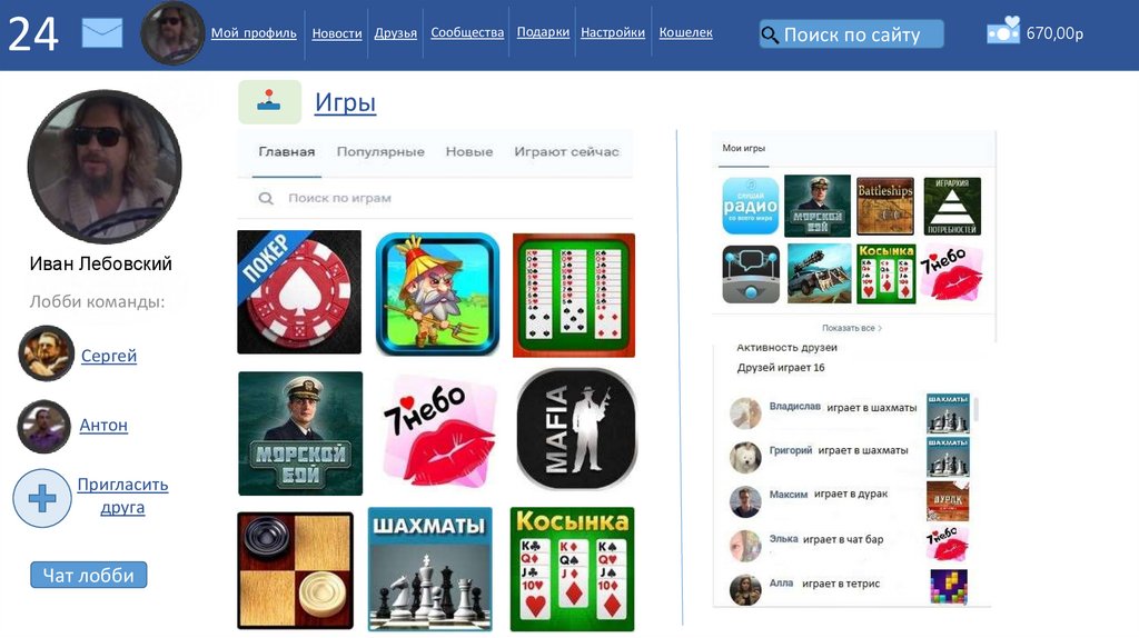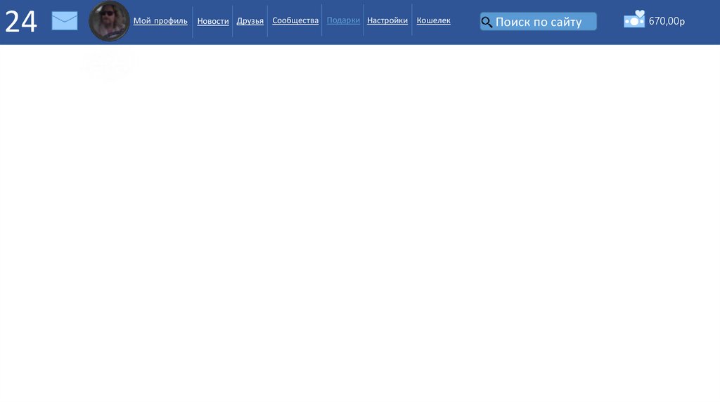 Новости Друзья Сообщества Подарки Настройки Кошелек