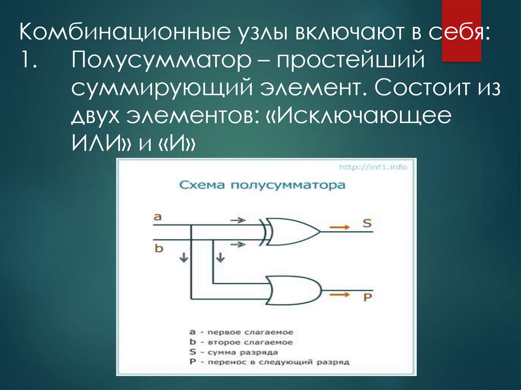 Комбинационные узлы включают в себя:1. Полусумматор – простейший