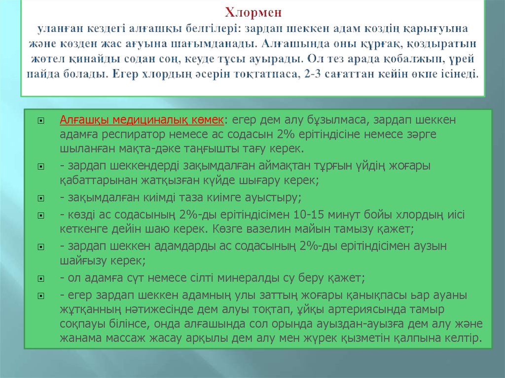 Алғашқы медициналық көмек: егер дем алу бұзылмаса, зардап шеккенадамға респиратор немесе ас содасын 2% ерітіндісіне немесе зәрге