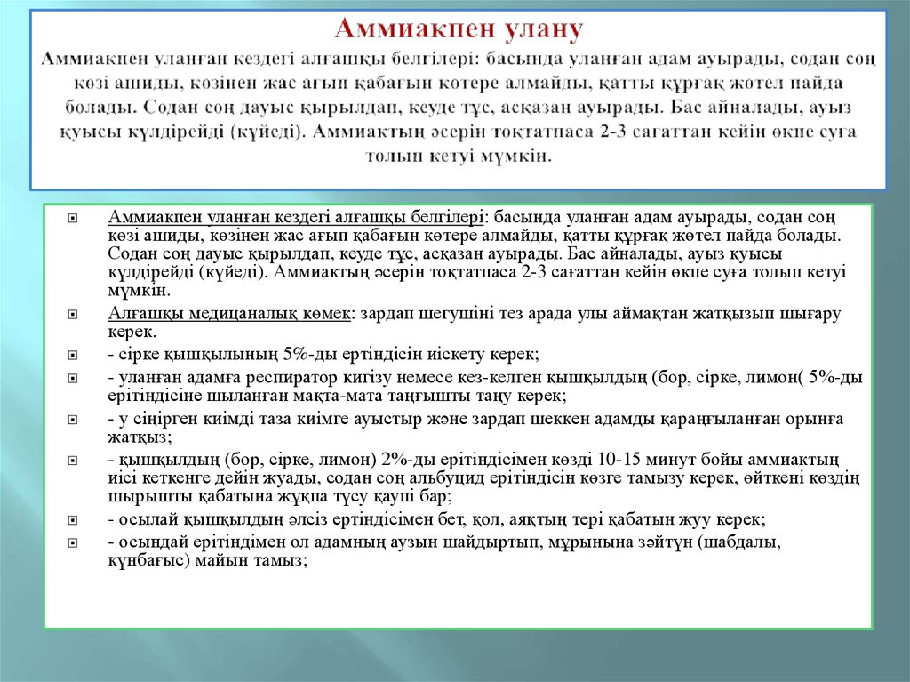 10. Аммиакпен улану Аммиакпен уланған кездегі алғашқы белгілері: басында уланған адам ауырады, содан соң көзі ашиды, көзінен жас