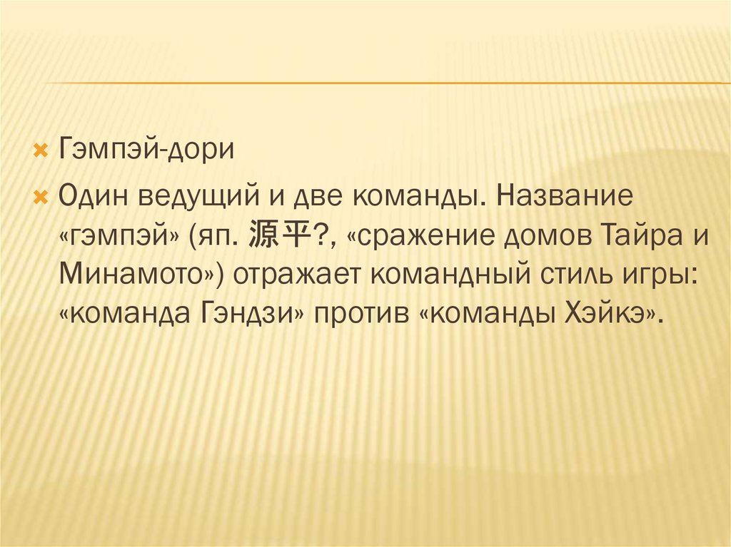 Гэмпэй-дориОдин ведущий и две команды. Название