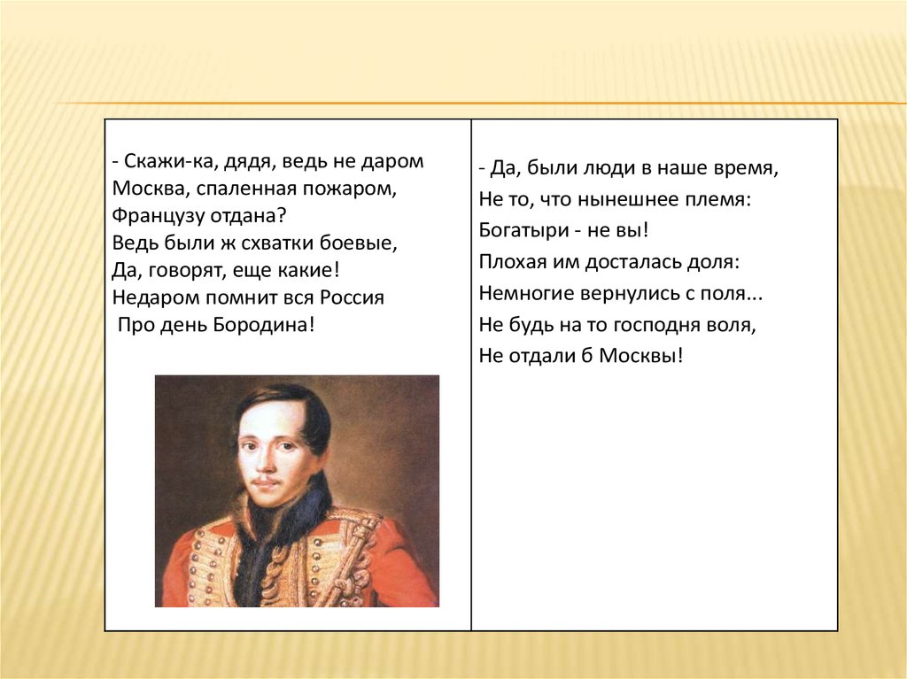 - Скажи-ка, дядя, ведь не даромМосква, спаленная пожаром,