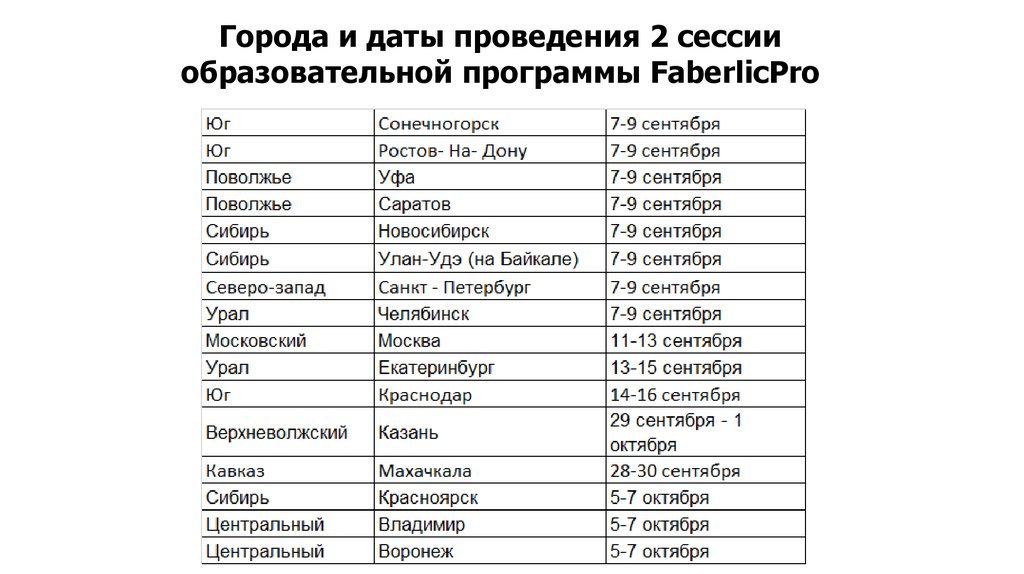 Города и даты проведения 2 сессииобразовательной программы FaberlicPro