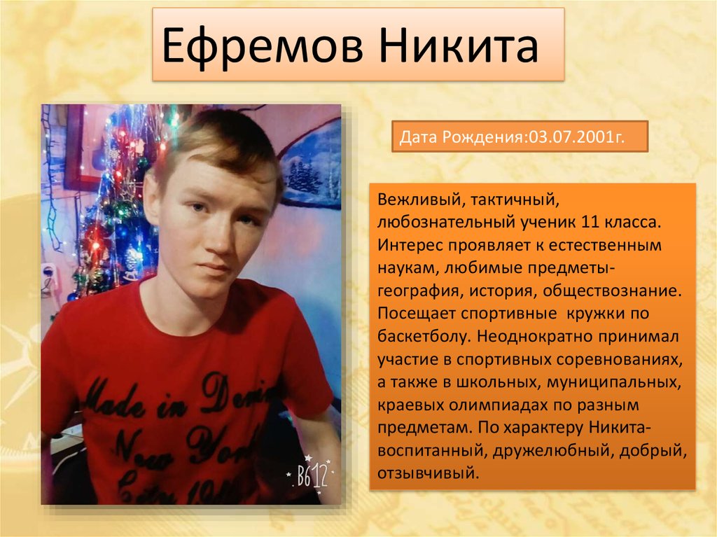 Ефремов НикитаДата Рождения:03.07.2001г.