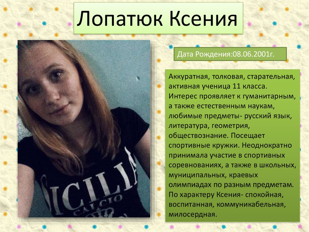 Лопатюк КсенияДата Рождения:08.06.2001г.
