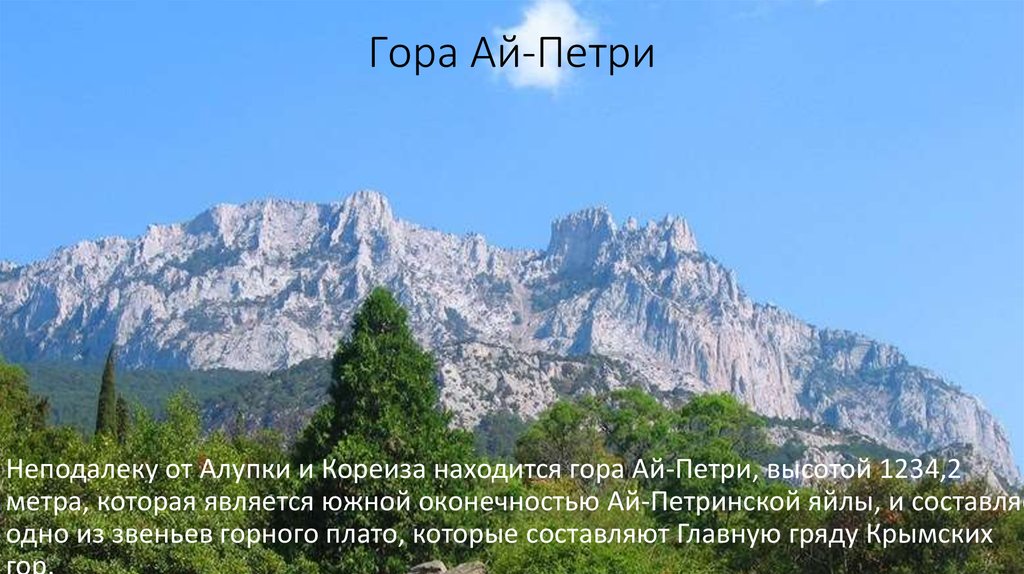 Неподалеку от Алупки и Кореиза находится гора Ай-Петри, высотой 1234,2