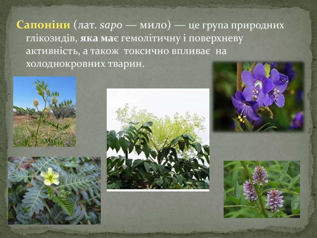 Сапоніни (лат. sapo — мило) — це група природнихглiкозидiв, яка має гемолiтичну i поверхневу