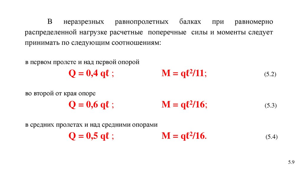 В неразрезных равнопролетных балках при равномернораспределенной нагрузке расчетные поперечные силы и моменты следует