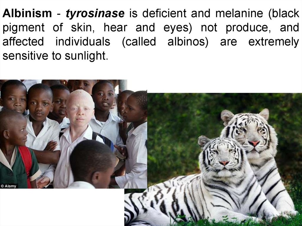 Albinism - tyrosinase is deficient and melanine (blackpigment of skin, hear and eyes) not produce, and
