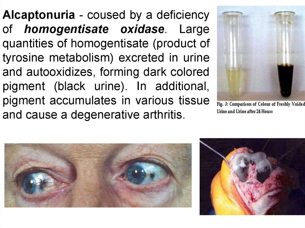 Alcaptonuria - coused by a deficiencyof homogentisate oxidase. Large