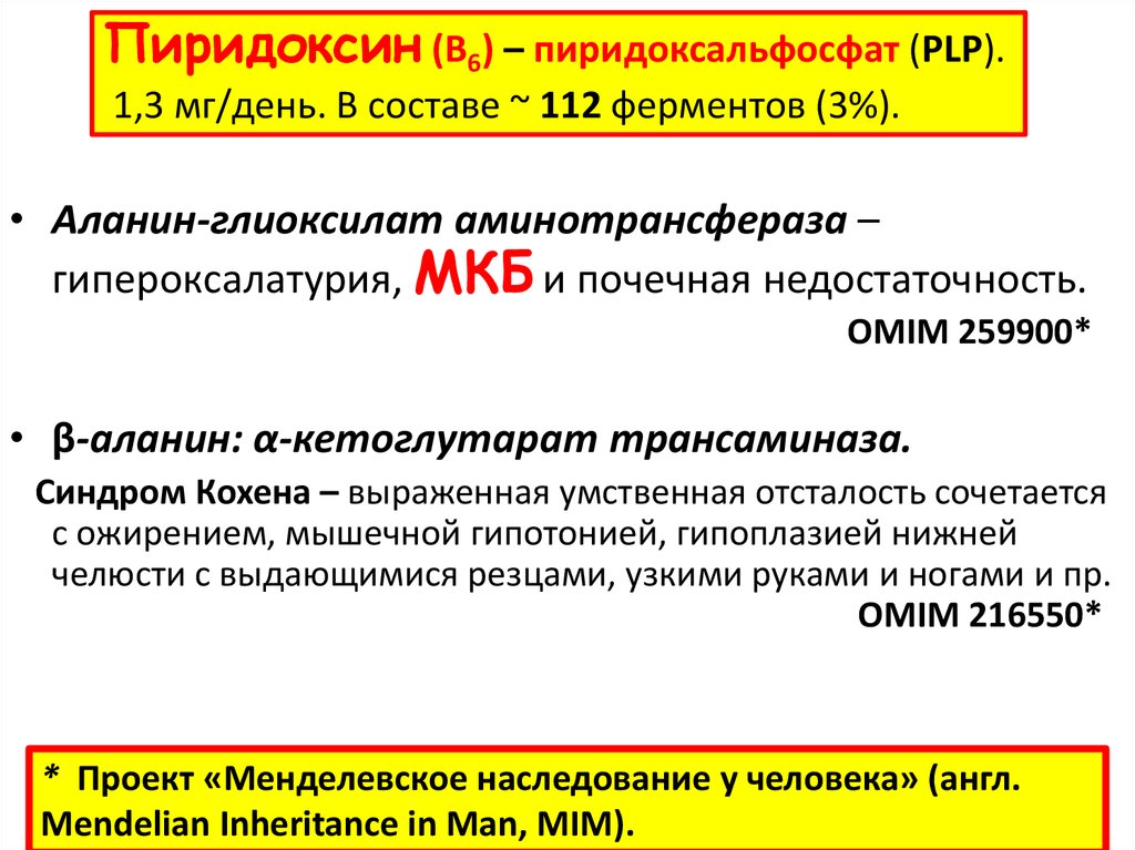 Пиридоксин (В6) – пиридоксальфосфат (PLP).1,3 мг/день. В составе ~ 112 ферментов (3%).