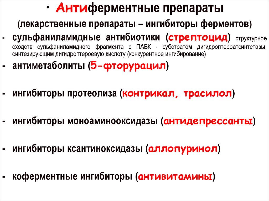 • Антиферментные препараты(лекарственные препараты – ингибиторы ферментов)