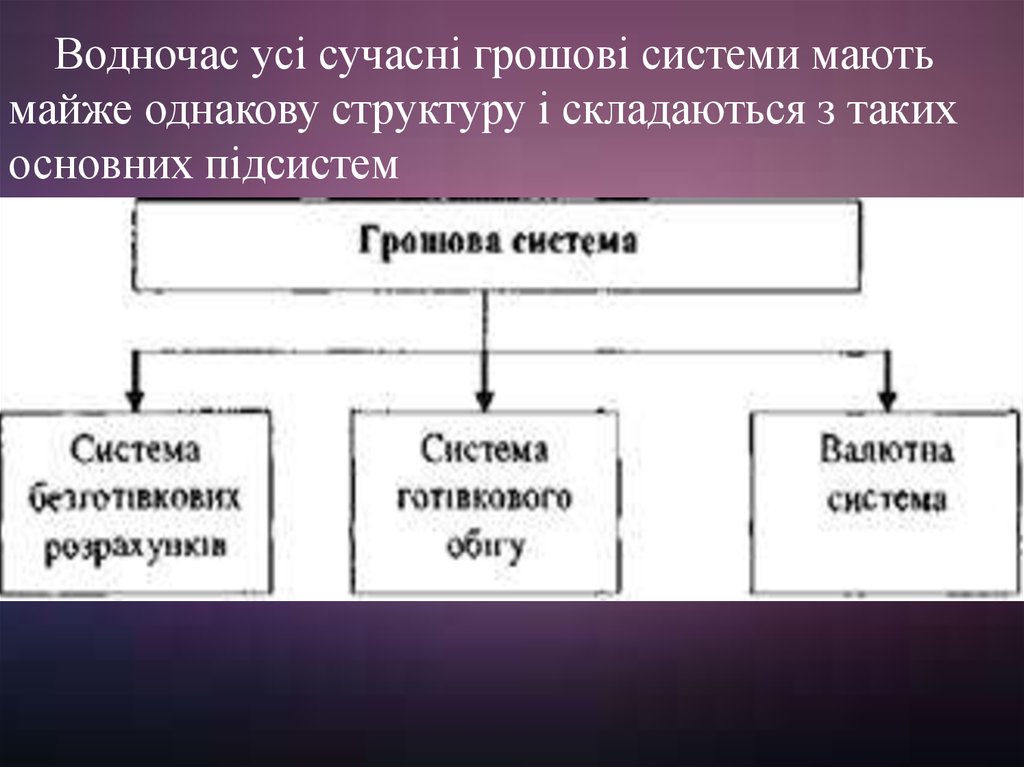 Водночас усі сучасні грошові системи маютьмайже однакову структуру і складаються з таких
