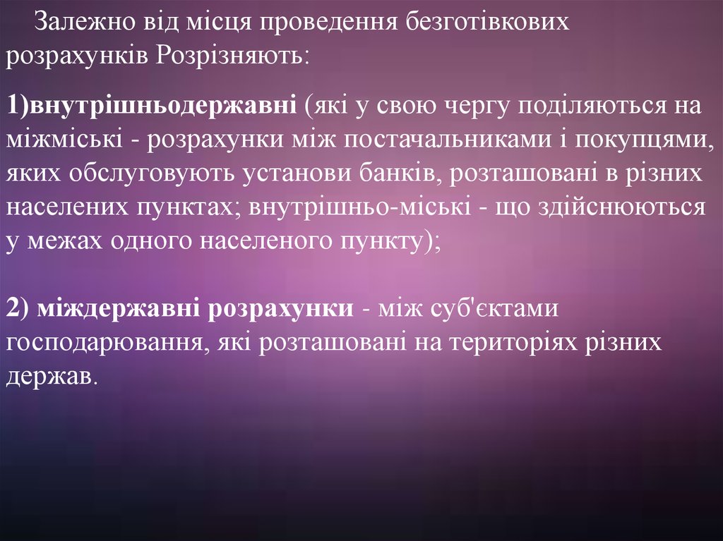 Залежно від місця проведення безготівковихрозрахунків Розрізняють:
