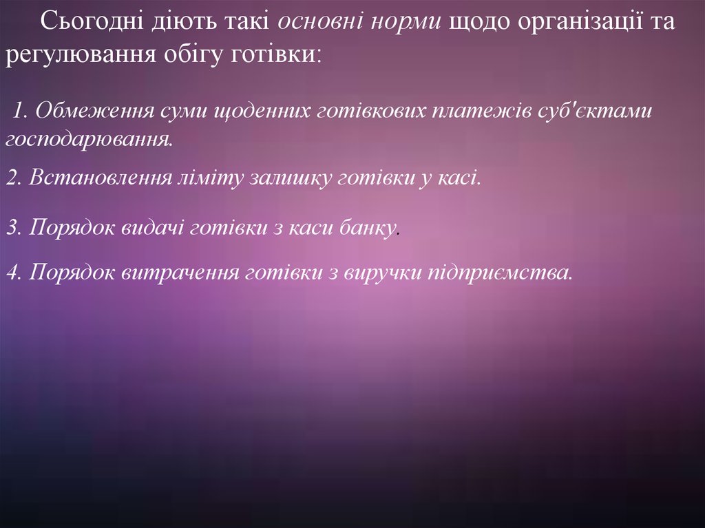 Сьогодні діють такі основні норми щодо організації тарегулювання обігу готівки: