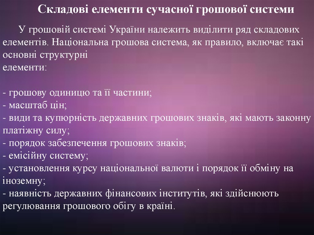 Складові елементи сучасної грошової системиУ грошовій системі України належить виділити ряд складових