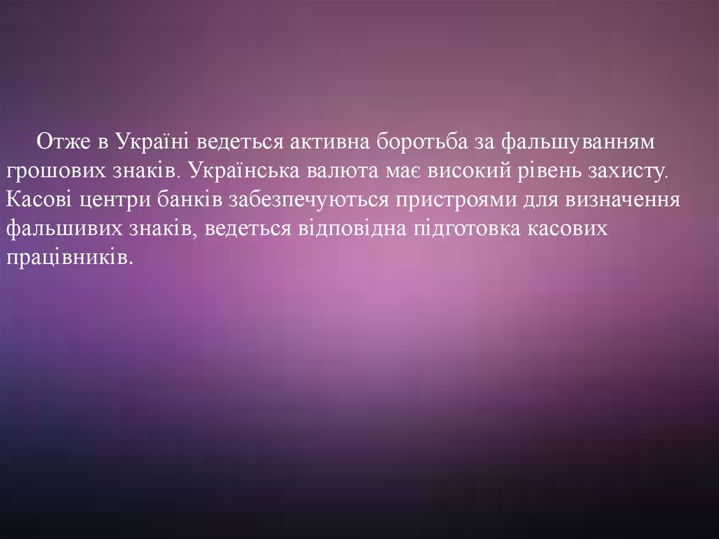 Отже в Україні ведеться активна боротьба за фальшуваннямгрошових знаків. Українська валюта має високий рівень захисту.