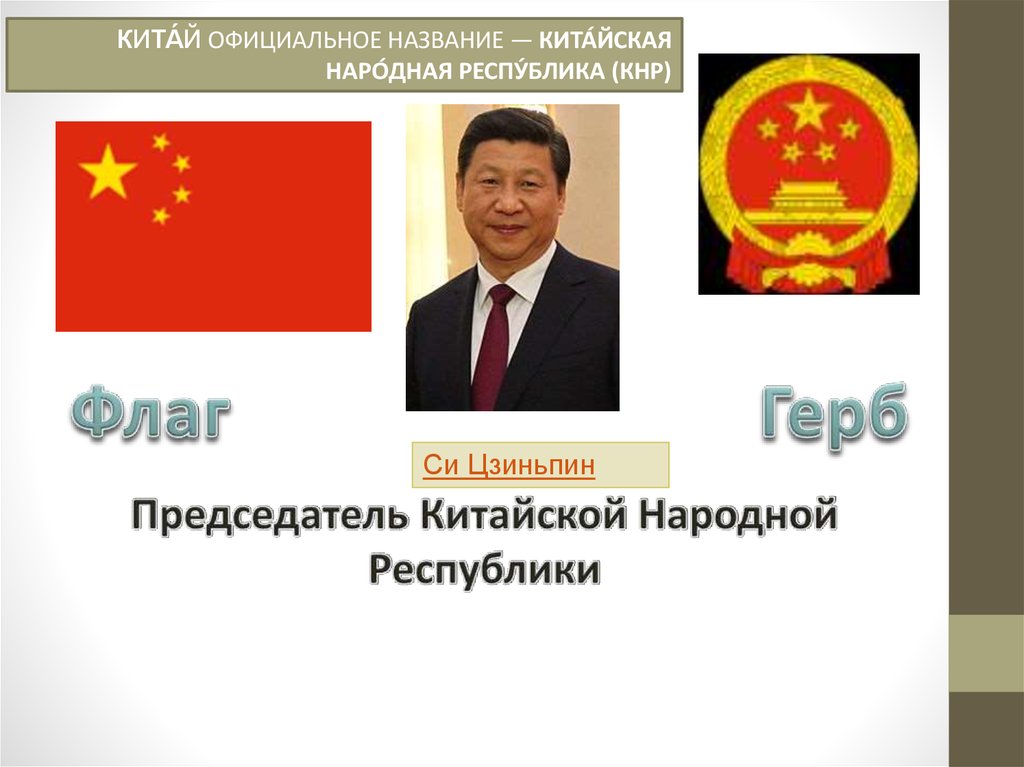 КИТА́Й ОФИЦИАЛЬНОЕ НАЗВАНИЕ — КИТА́ЙСКАЯНАРО́ДНАЯ РЕСПУ́БЛИКА (КНР)